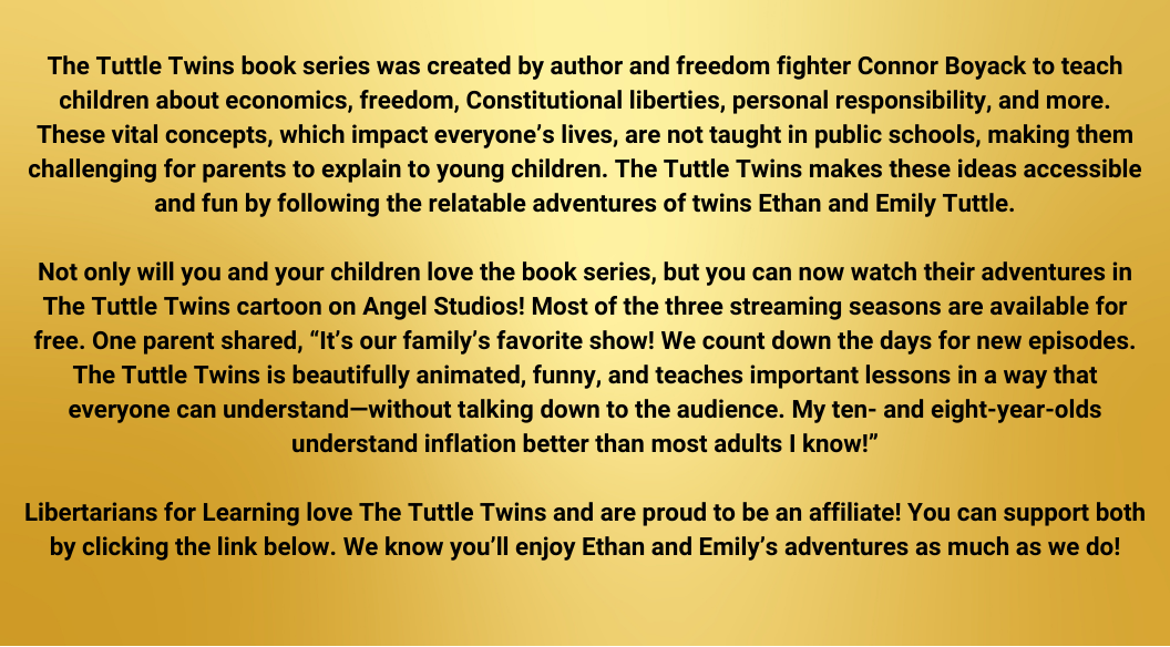 Two torches of illuminated books on either side of "Libertarians for Learning"